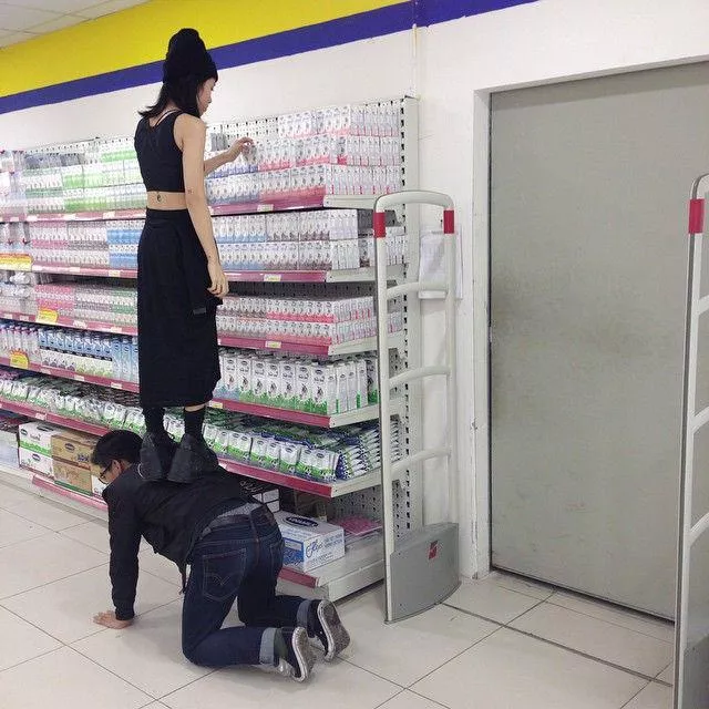 "Attention all shoppers: public humiliation in aisle 3". It's embarrassing that now we can't even go to the store without female supervision, but at least pigs can still be useful when she needs milk from the top shelf. I just wish I could do it with